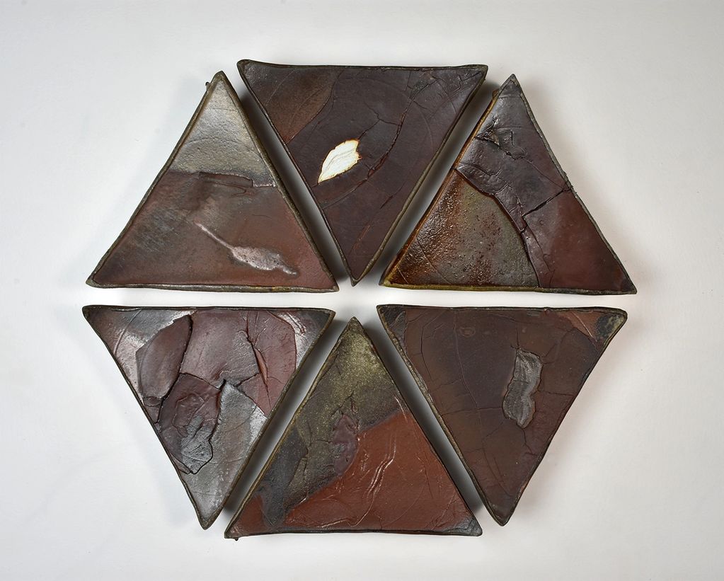 6 part Wall Object Arrangement, April 2021, wood fired iron bearing stoneware, 32” x 28” x 5”