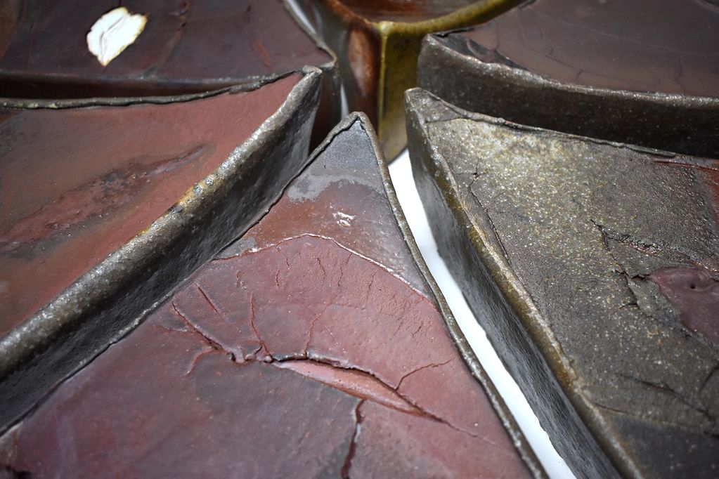 Detail of 6 part Wall Object Arrangement, April 2021, wood fired iron bearing stoneware, 32" x 28" x 5"