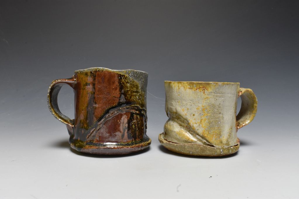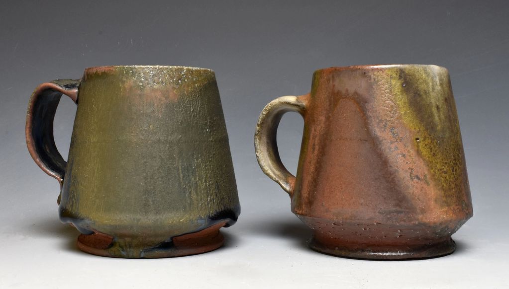 Pair of Mugs, April 2021, wood fired iron bearing stoneware, 4.5” x 4.25 x 4”